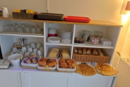 Viennoiseries du jour, pain croustillant, confitures bretonnes et jus de fruits variés.